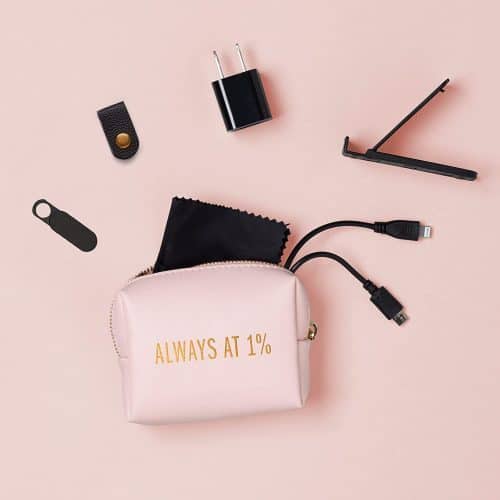 Keep everything you need with you in this Pinch Provisions Tech Kit. This includes 8 must-have tech accessories: earbuds, 2-in-1 charging cable, USB wall charger, microfiber screen cloth, 2 vegan leather cord organizers, a phone/tablet stand, and a password hint list.