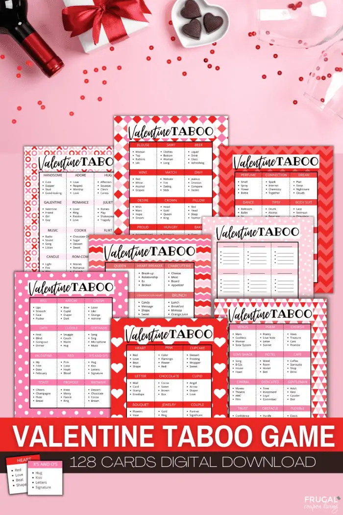 Get your copy of Valentine Taboo Cards here. Included with the set are 128 Forbidden Word Cards for Valentine’s Day.
