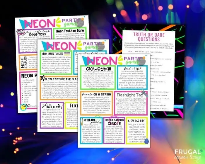 The full list of games includes Gloweyball, Minute to Win it Suck It Up, Donuts on a String, Flashlight Tag, Neon Art Gallery, Break Dance Circle, Glow Easter Egg Hunt, Neon Lawn (or Tarp) Twister, Keep It Up Balloons, Glow Capture the Flag, Gum Ball Pie, Glow Ball Blow, Flick N Sticks, Glow in the Dark Ring Toss, Neon Truth or Dare and Night Statues.