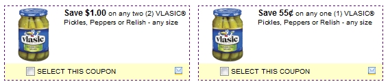 This is a brand you don’t always see coupons for – VLASIC. Get $.55 or $1/2 ANY SIZE VLASIC® Pickles, Peppers or Relish.