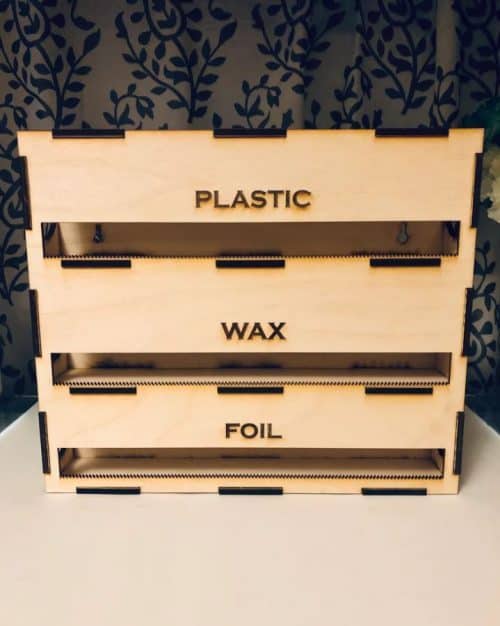 Organize all your sandwich and storage wraps with this Wooden Kitchen Plastic Wrap Organizer! This allows for most standard size rolls.