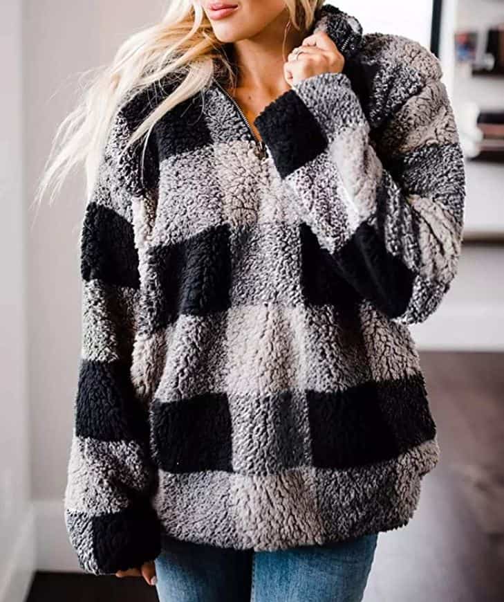 This half-zip pullover features the softest fabric, long sleeves, a classic plaid pattern, a working half zipper, a flattering fit and side pockets. It’s perfect for cold mornings, nights and everything in between. You will be looking for every excuse to wear this pullover.