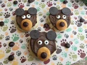 - Place a small dab of chocolate frosting on the brown M&M’s and give the bear a nose.