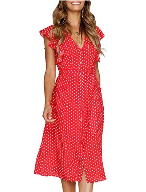 I love anything and everything polka dot, so this Polka Dot Swing Midi Dress is going in my cart. Not only does it have polka dots and cute ruffles on the sleeves, but it has pockets, too!