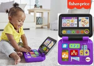 The Fisher-Price Laugh & Learn Click & Learn Laptop helps keep your baby busy with lots of hands-on play! As your baby presses, flips, and slides the different activities on their pretend computer, they’ll hear exciting songs, sounds, and phrases that teach numbers, colors, shapes, and more! Where development comes into play Academics: Playful songs and phrases introduce number, the alphabet, shapes, colors, and more. Fine Motor: As little fingers press, flip, and slide the hands-on activities, fine motor skills like dexterity and hand-eye coordination are being fostered. Creativity & Imagination: The realistic design encourages early role play and imaginative fun as your little one pretends to “work” from home!