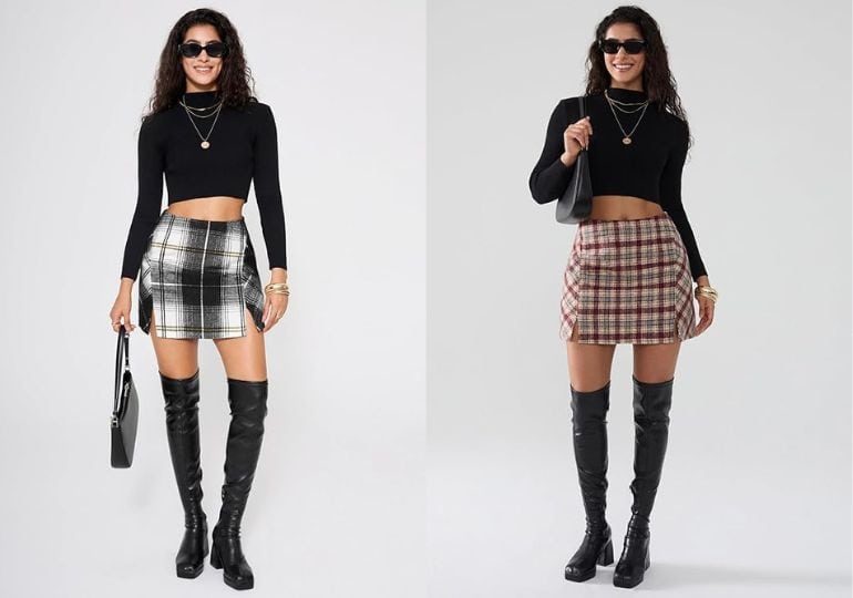 You need this Faux Wool Mini Skirt in your skirt. It’s cute, chic and perfect for transitional weather. This women’s high waisted bodycon plaid mini skirt is made of 100% polyester. The faux wool fabric is soft, comfortable, thick, warm, and shrink-resistant. It is machine washable and tumble dryable, suitable for wearing in Spring, Fall and Winter.