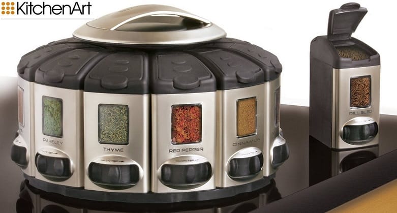 In need of easy storage for your spices? The KitchenArt Select-A-Spice Auto-Measure Carousel provides a unique way to store and sort cooking spices. The Auto-Measure Carousel can be mounted under the cabinet or double stacked. 55 spice labels are included for you to apply to the 12 canisters for easy assortment (spices not included). Each canister holds 4.5 oz. of spices and automatically measures a perfect 1/4 tsp with each click. The canister also gives you the option to either shake or pour your spices out. Witness the space-saving functionality of this useful tool.
