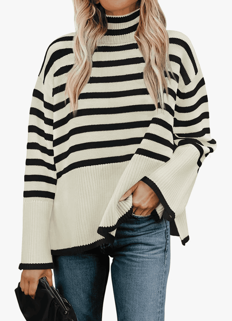 This long-sleeved sweater is the ideal choice for Fall and Winter. It features a high-neck, flared sleeves, ribbed cuffs and hem, a side slit, and a relaxed fit. You can get these in solid colors or stripes. Pair it with your favorite skinny jeans or leggings for an easy cold-weather look.