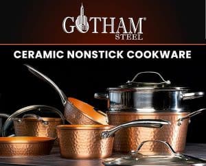 Designed in Italy, the Gotham Steel Hammered Collection 10 Pc Cookware Set marries the traditional beauty of hammered copper with the latest in non-stick advances. Aluminum construction, triple-coated with our proprietary Ti-Cerama surface produces even heat for simmering risotto and sauces, pan-frying or slow-braising meats, and stews. It is PTFE and PFOA free which means nothing will stick. Cooking without butter or oil. Gotham Steel will change the way you cook and clean. The Ti-Ceramic coating allows for easy clean-up and dishwasher safe. This set includes everything you need to outfit your kitchen and get cooking right out of the box.