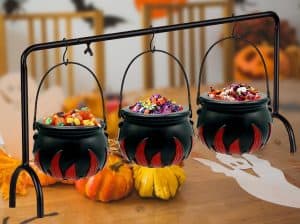 Double, double, toil, and trouble. . . Whether you’re hosting a costume party, decorating for a haunted house, or adding a frightfully fun touch to your home decor, this Halloween Witches Cauldron Hanging Candy Bowl Set is the ultimate way to serve candy or other treats. The included black metal rack with three hooks provides a convenient display option for the plastic cauldrons, adding a touch of spookiness to your Halloween event. The black cauldron bowls combine Halloween elements with red flames on the surface, each one measuring 5.6×3.9 inches. The metal decorative stand measures 22 inches wide and 11 inches tall.