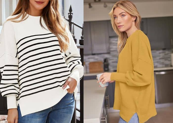 This crewneck long sleeve sweater is the perfect tunic top to wear with leggings or skinny jeans. It features a  side split hemline, an oversized design, and vertical grain cuffs to add to the chic look. Throw this on with your favorite pants or skirt, and add sneakers or boots for a cute Fall look.