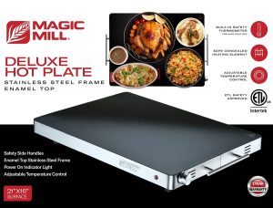 The ultimate Magic Mill Extra Large Electric Food Warmer keeps food at the perfect temperature! Big enough to hold several dishes at once, it features elegant styling that enhances the appearance of any table or buffet. The glass surface and brushed metal housing are easy to clean, and 4 different heat settings maintain the optimum serving temperature for a wide variety of dishes. The warming tray comes with hard mounted side handles to ensure that you can easily transport your buffet server from one location to another. This lightweight and compact portable food warmer is safe to use on your kitchen counters or serving tables. All in all, this unit will have you covered from the beginning of your party to the very end! The large 21″ x 16″ surface area holds several dishes at once, and it’s tempered glass surface makes cleaning a breeze.