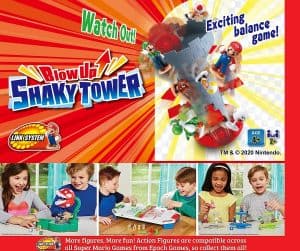 The exciting balancing tabletop action game with everyone’s favorite Super Mario characters! The Epoch Games Super Mario Blow Up! Shaky Tower Balancing Game includes easy-to-assemble Tower with 7 unique Super Mario Action Figures and die. Classic game play starts when one player rolls the die to determine how many characters to place on or take off from the Tower. Be careful not to lose balance or the tower will blow up and Mario and his friends will fall! Epoch Games Link System allows Super Mario Action Figures from Blow Up! Shaky Tower to play across the range of games including Balancing Games, Piranha Plant Escape and more! Suitable for the whole family, including children ages 4 and older.