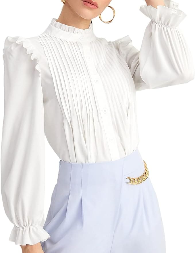 This top is made with lightweight and soft material, which is smooth, breathable, comfortable to wear. It features a pleated front, ruffle trim, flounce sleeve, mock neck, elastic cuffs, long puff sleeve, and a button down closure