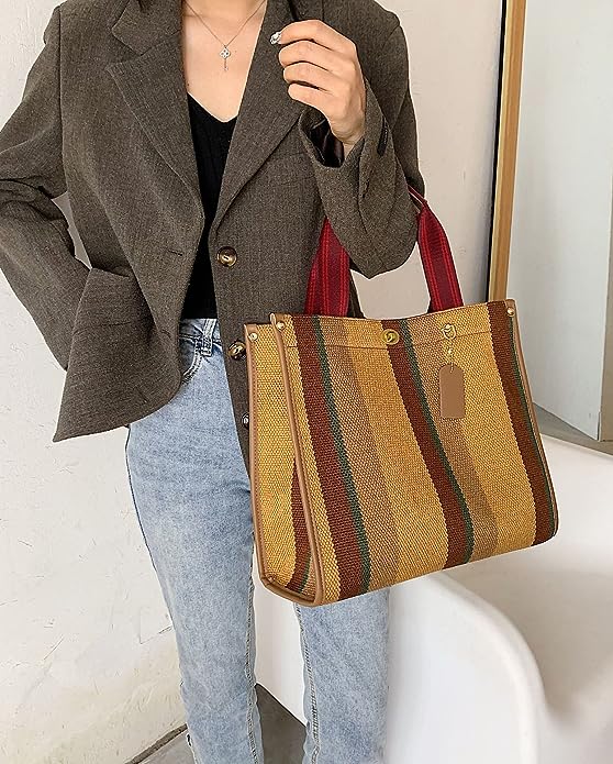 The outer is made of high-quality canvas,and the inner made of polyester and faux leather, using quality hardware. It’s soft and comfortable to carry, lightweight, durable and delicate. and the padded handle can reduce the pressure when carrying. This purse has a fashionable vintage color and a stripe design, It fits well with different outfits and clothes, so you can wear it with pretty much any outfit.