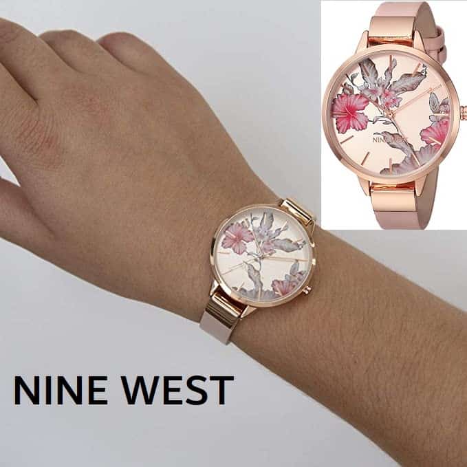 The Nine West Women’s Floral Dial Strap Watch features a mineral crystal lens; light rose gold-tone textured dial with 3d printed floral design; rose gold-tone hands and markers. It comes with a blush pink strap with buckle closure and has Japanese-quartz Movement.