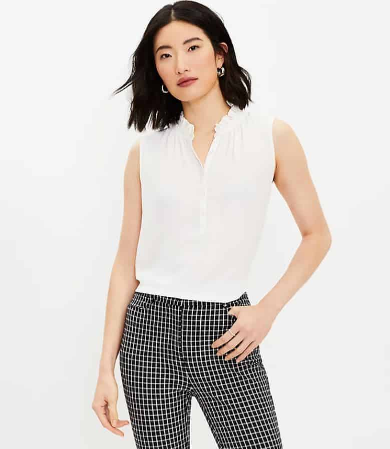 I love this Ruffle Mixed Media Shell because you can pair it with anything – jeans, dressy pants or a skirt. It’s very versatile.