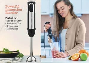 Discover a new world of innovative cooking possibilities with the Peach Street 500 Watt Immersion Blender. It’s lightweight body along with its ergonomically-designed non-slip handle is so comfortable to hold and control that cooking won’t ever feel like a chore again. Whip up all of your favorite gourmet soups guacamole smoothies/shakes cake batter salsas sauces marinades salad dressings or even homemade baby food. With the heavy-duty motor, it works quickly and effectively, expertly mixing anything you desire into a smooth evenly-mixed medley of mouth-watering flavors. It’s slim design enables this hand blender to fit into any mixing bowl, pot or cookware without restriction. It’s compact enough to fit anywhere but powerful enough for the toughest blending jobs.