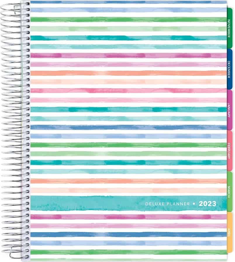 This Deluxe Planner has tabbed sections by month, planning stickers, a bookmark, a pocket folder and more. It comes in several different design options as well.