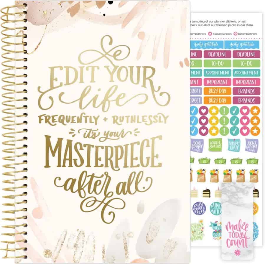 I love the thought on this Bloom Daily Planner – Edit your life frequently + ruthlessly, it’s your masterpiece after all. This planner has a bunch of stickers, which I love to use in mine. It also has places to track your goals and values, monthly spending, joy list and more.
