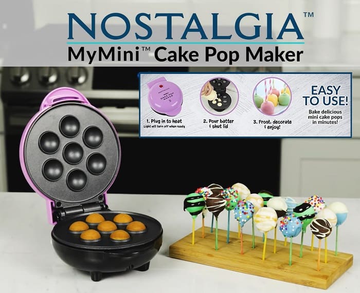 Make yourself and others tasty, mini cake pops in all sorts of flavors with the Nostalgia MyMini Cake Pop Maker! Create up to 7 cake pops in no time. Simply plug it the cake pop maker, wait 1-3 minutes until pre-heated, once the indicator light shuts off you can begin cooking! Its non-stick surface and cool-touch handles allow for a safe experience for everyone. Once finished easily store away making its compact size perfect for dorms, RV’s, apartments, and more!