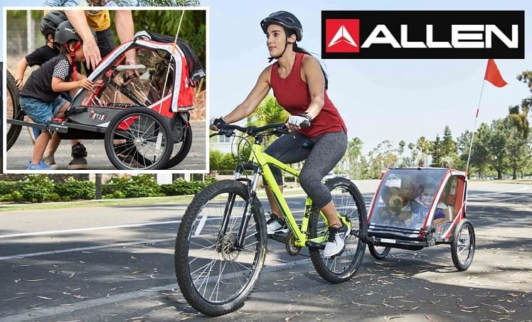 The Allen Sports Deluxe Steel Child Trailer offers the perfect outdoor solution for active parents. Safely and comfortably transports your children. Lightweight steel construction trailer with durable quick release 16″ steel wheels. Large front and side windows provide a bright, airy cabin for your little riders. Footguard tube protect passenger’s feet, and a padded five-point safety harness comfortably holds your child in place. Folding design with quick release wheels makes for easy transport and storage. Universal coupler secures to your bicycle’s rear axle and makes installation and removal from your bicycle a snap. Trailer includes a safety flag for added visibility when riding. All Allen trailers pass the ASTM trailer safety standards.