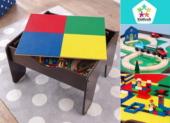 Who knows what creations the KidKraft 2-in-1 Reversible Top Activity Table will inspire? The reversible table top features an illustrated play surface on one side, and a building brick surface on the other. It includes 200 building bricks and a 30-piece wooden train starter kit to get little engineers started on their first creations. When playtime is done, the table top lifts to reveal a storage area underneath (you’re welcome parents!). This versatile table is carefully constructed with rounded corners for years of safe, imaginative fun. The classic natural wood finish will look great in any playroom, bedroom or living room.