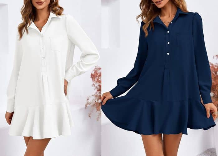 Combine the look of a button-down shirt with a dress in this Women’s Button-Down Shirt Dress. This is a cute style that totally works.