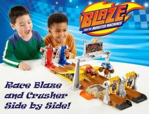 On your mark…get set…GO! Kids can send Blaze and Crusher racing head to head against each other with the Fisher-Price Blaze and the Monster Machines Mud Pit Race Track Playset! This high-octane vehicle playset features multiple configurations, reusable Nickelodeon Slime brand compound, and two launchers to send the monster trucks racing forward, over the ramps, and flying through the air over the filthy mud pits. Will both trucks make it over the pits or will one truck end up covered in ooey, gooey, mud slime? Anything is possible with this action-packed racetrack. Kids will love being part of the adventure and action with cars and playsets inspired by Blaze, a champion and hero monster truck, his driver, 8-year-old AJ and their friends from Axle City.