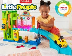 At the Fisher-Price Little People Light-Up Learning Garage with Smart Stages, toddlers can “fill” up, tune up and “wash” their car before racing along to the next adventure! This interactive car garage playset features multi-color lights and 3 Smart Stages learning levels of songs, sounds and phrases to enhance your child’s pretend play. Kids can act out fun stories with 2 character figures, 2 mechanic’s tool play pieces, and a push-along toy car with a hood they can open and close. Working elevator for figures and cars, send cars racing down the ramp, “fill up” or “charge” at the station, tune up with the screwdriver and wrench pieces. Bringing a smile to milestones! This toy encourages Talking with sung songs and phrases that can expand your toddler’s vocabulary and encourage storytelling play.