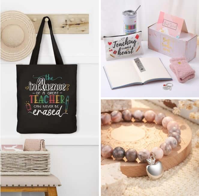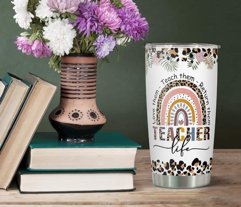 This Teacher Appreciation Gift Set is a great option and comes with a 20 oz original design stainless steel tumbler, a canvas pouch bag, a bookmark, a keychain, a pair of fuzzy socks, and a best wish card.
