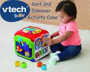 The VTech Sort and Discover Activity Cube is five sides of fun! your little one will love exploring seven fun activities and two electronic panels that introduce colors, numbers, animals and more. Turn the book page, twist the spinner and slide the animals to develop fine motor skills. The activity cube also develops hand-eye coordination with the shape sorter and colorful shape blocks. This durable toy will hold up to a toddler’s rough handling.