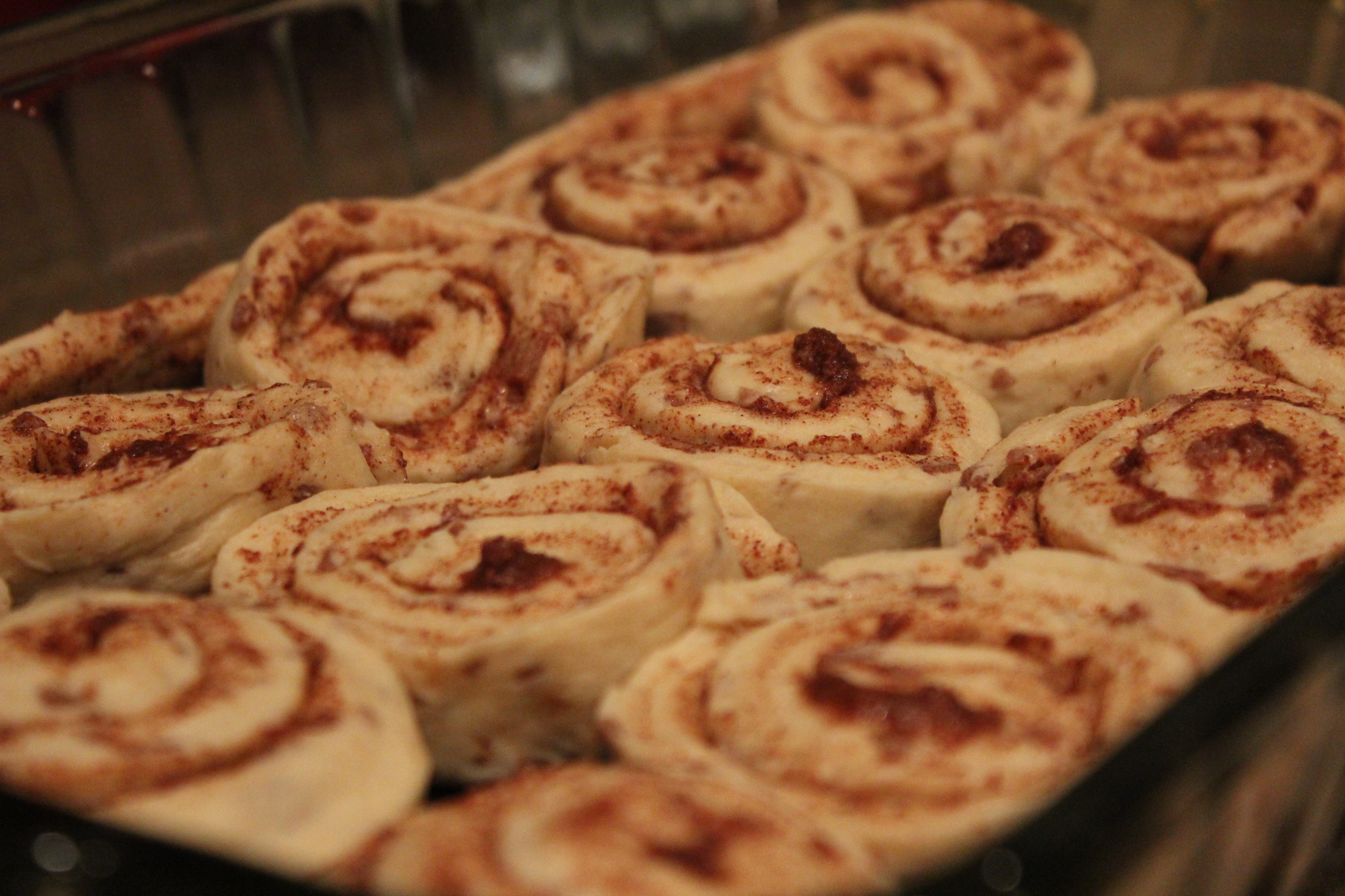 In deep dish lasagna 9×13 pan, place cinnamon rolls on the bottom.