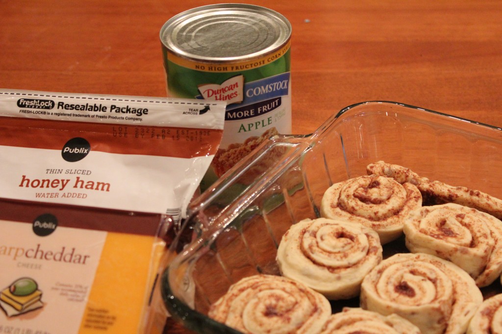 Pop it in the oven for about 30 minutes and serve with the Sour Cream-Brown Sugar Sauce and Syrup (if desired). This got great reviews from the parents at my eldest daughter’s school Holiday Party and I agree, it was good and the Publix brand cinnamon rolls were awesome!