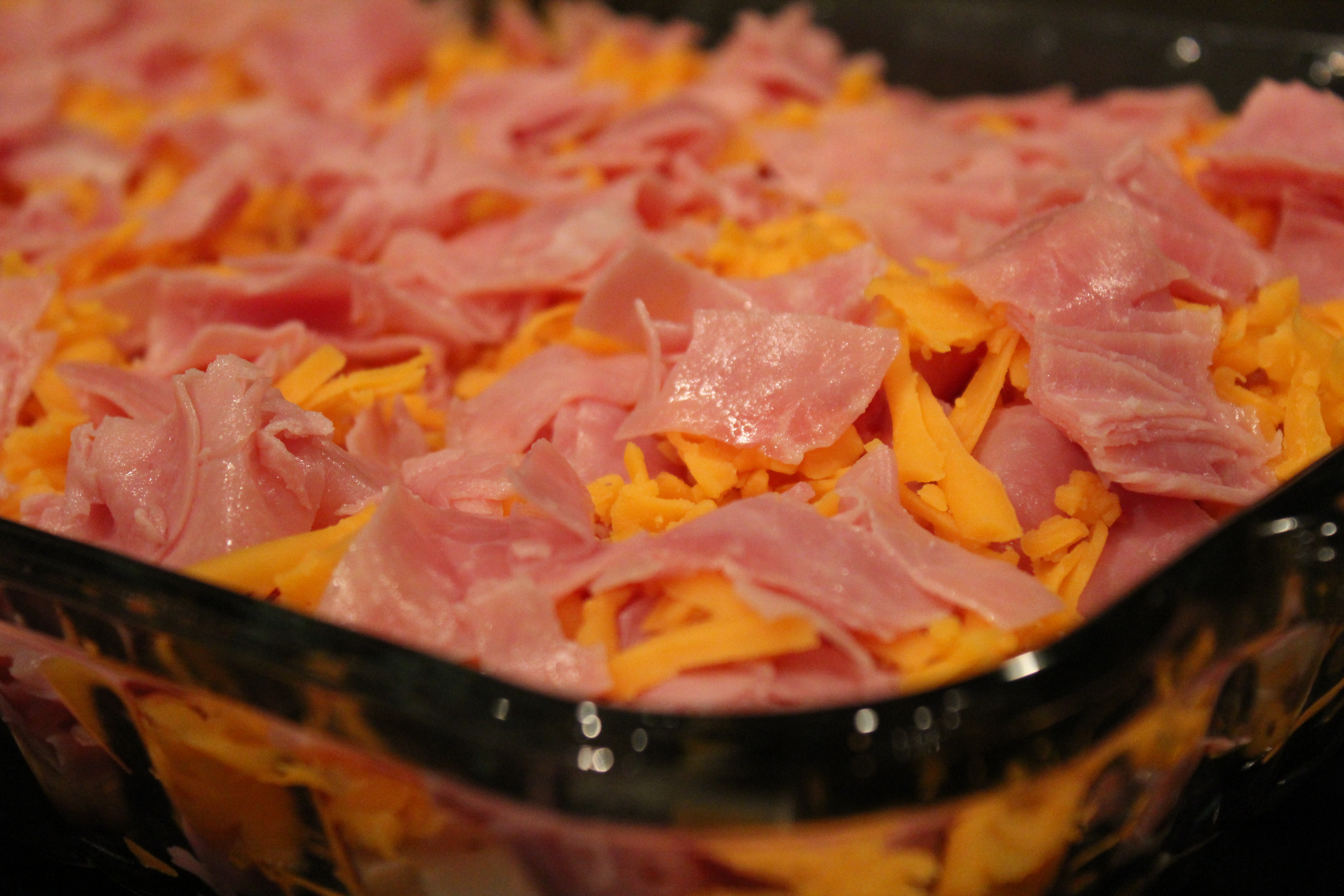 Layer ham on top and then half cheese.