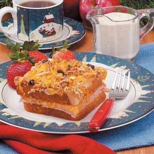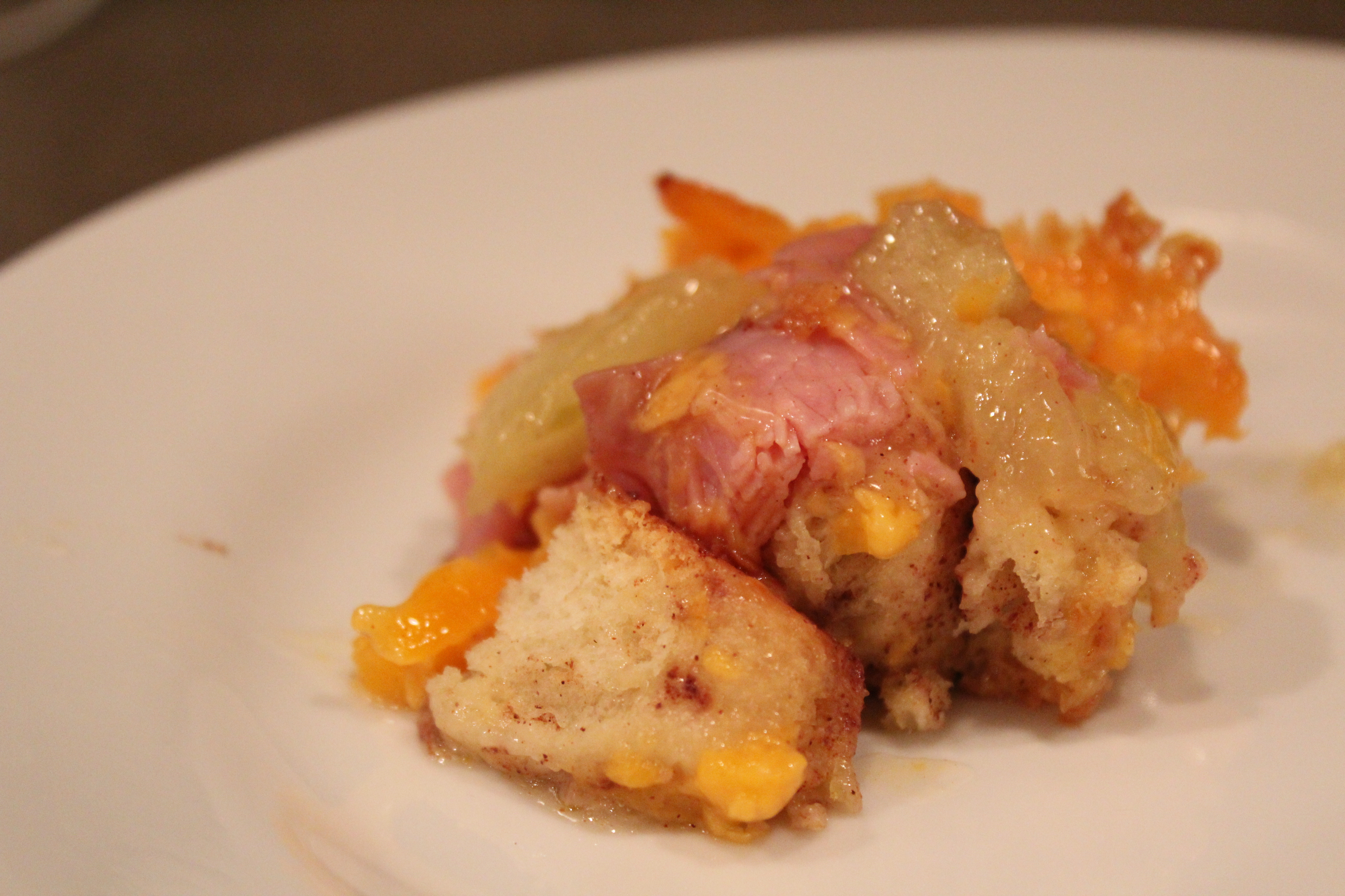 Once the Cinnamon Rolls are cooked, top with the icing that comes with them. Then top with Apples, then Ham (I used lunchmeat) and finally cheese (another change I made after cooking this once. Two layers of cheese was a little bit much; but definitely do one generous layer!