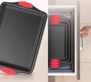 The NutriChef Nonstick Baking Sheet Set provides excellent food release when baking, roasting, etc, and offers easy cleanup. Dishwasher Safe and stain-resistant. It is also a space-saving stackable wide tray pan design. The commercial-grade restaurant-quality kitchen bakeware features red silicone handles to prevent accidental burns. Also stain-resistant, easy to clean & dishwasher safe but hand washing is recommended to extend pan life