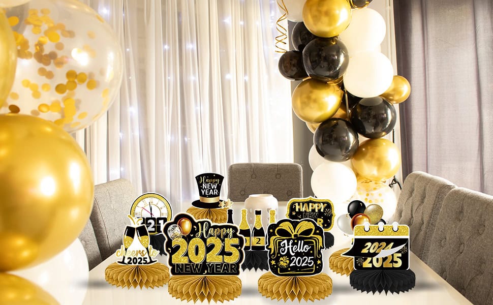 • New Years Decorations 2025: Welcome the arrival of 2025, this 9-piece New Year themed table decoration set, with its unique honeycomb design and bright festive colors, will add infinite vitality and festive atmosphere to your New Year party. Each decoration exudes the joy and blessings of the New Year.
