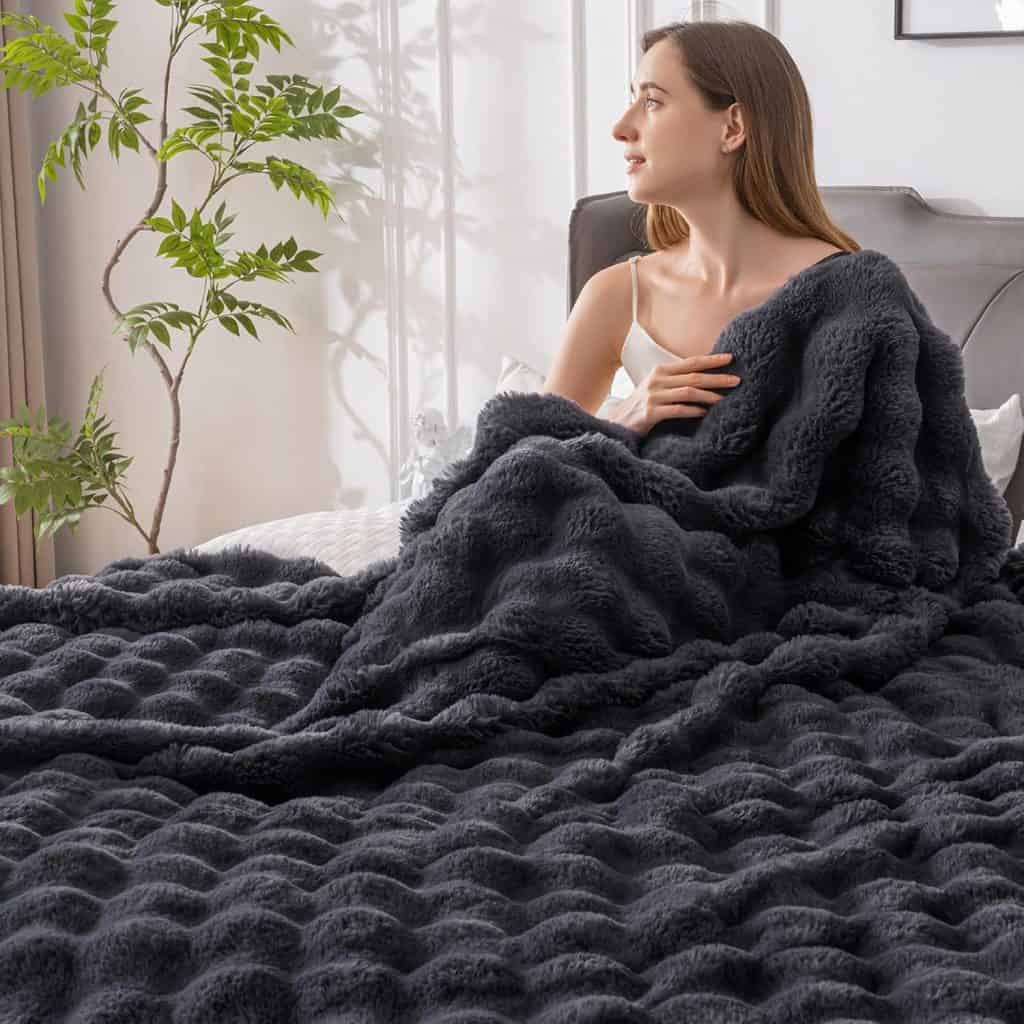- Unique Bubble Design: The faux rabbit fur blanket innovative bubble shape design not only makes the appearance fashionable, but also adds a warm atmosphere to the room. The overall design of faux fur blanket is elegant and refined. Whether the fur blanket is placed in the living room, bedroom or as a companion when traveling, it can show the high taste and lifestyle of the users