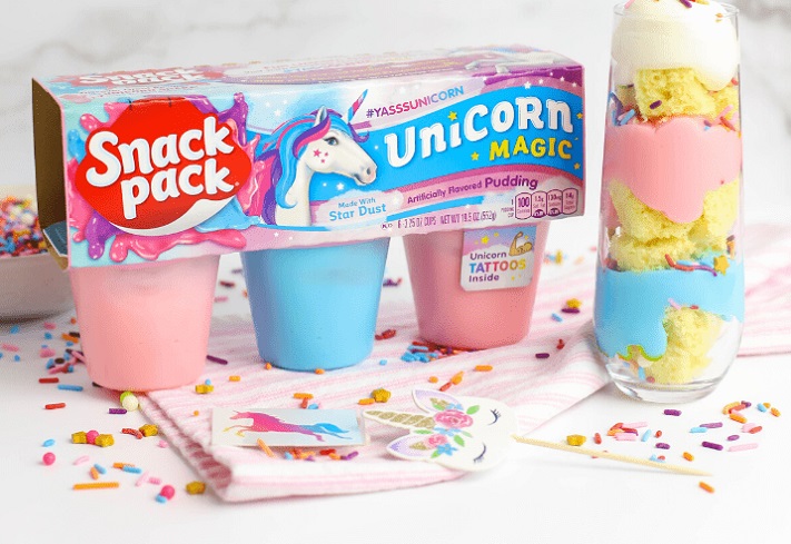 Transform any day into a magical wonderland with SNACK PACK Unicorn Magic Flavored Pudding Cups. Made with real milk, fairy dust and princess kisses, every bite tastes like joy and rainbow sparkles. Unicorn Magic Flavored SNACK PACK Pudding Cups are gluten free with 0 grams of trans fat per serving, no high fructose corn syrup and no preservatives. So stock up on these magical pudding cups for onthego snacks and after meal treats. You also can pack them into school lunch boxes to brighten your little royal one’s day. You’ll receive eight 6count packs for a total of 48 3.25ounce pudding cups with 100 calories each. Plus, surprise your child with the special unicorn tattoos found inside. With SNACK PACK Unicorn Magic Pudding Cups, every snack time can be magical.