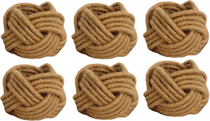 This lovely set of 6 jute napkin rings adds a Bohemian touch to your table decor, and the set gives you enough to equip several tables during a cocktail party. Place several of these napkin holders at your kitchen counter or home bar, and stuff them full of cocktail napkins for your guests.