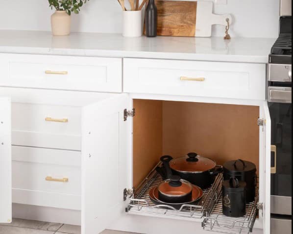 Easily store cookware and bakeware with this Holdin’ Storage Pullout Cabinet Organizer. This kitchen cabinet roll out shelf is manufactured with a pull out system that slides out ultra-smoothly all the way for easy access.