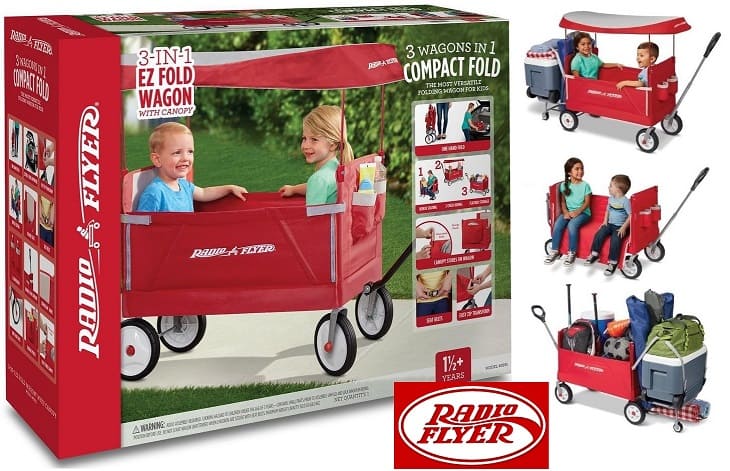 The Radio Flyer 3-in-1 EZ Fold Tailgater Wagon with Canopy is designed as a full sized wagon for 2 kids that folds compactly and offers 3 different modes. With an easy one hand fold, you can take or store the wagon anywhere. The wagon features 3 modes: 2 kids riding, flatbed or cargo hauling, and bench seating. Simply unhook the side panel to move the wagon from hauling or riding mode into bench seating mode. The high Seat backs and thick padded seat provide a comfortable ride, while the telescoping handle offers easy transport When folded. The DuraCleanTM fabric is durable and can be easily wiped clean. The wagon also features a UV blocking canopy and 2 cup holders.