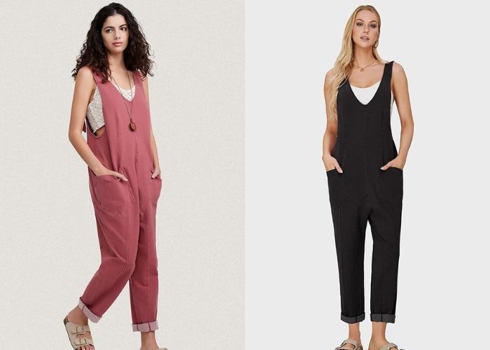 These loose fit overalls feature long baggy pants, a loose style, v-neck design, spaghetti straps, two sides pockets and a solid color for a chic, trendy look.
