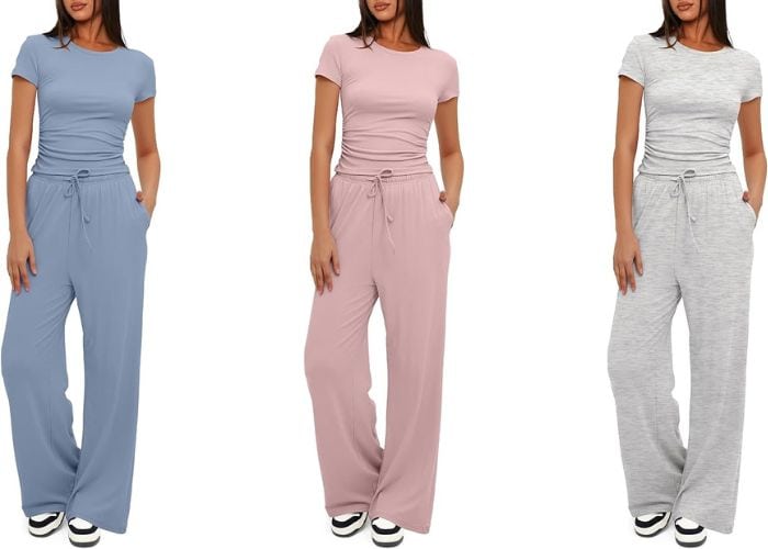 This set features a top with a crew neckline; short sleeves; ruched sides; and a relaxed, cropped silhouette. The pants have a high rise fit, drawstrings, two side pockets, and a wide leg silhouette, Elastic and comfortable fabric for every day and any wear.