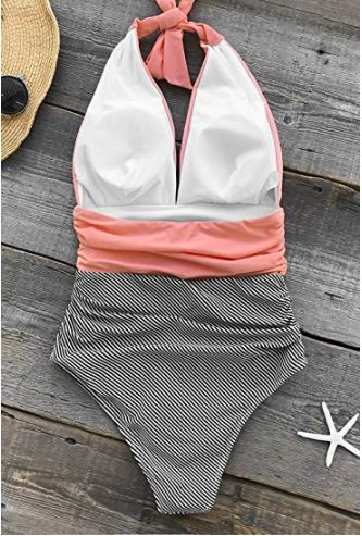 This is another fun, striped bathing suit that you’ll want to have. The CUPSHE Women’s Stay Young Stripe One-Piece Swimsuit has the side tie that I love and a vertical stripe pattern is more flattering than horizontal stripes.
