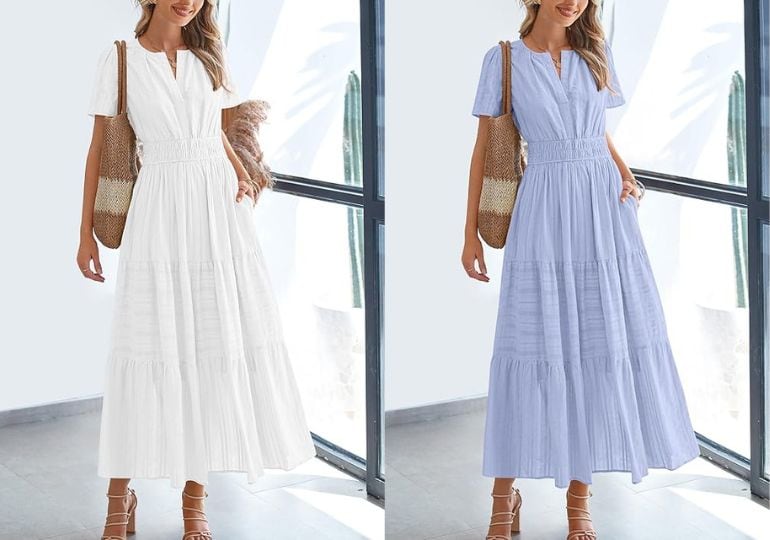 This dress features charming short sleeves, a V-neck, a loose fit, a modern elastic waist, a pleated skirt, and a flowing tiered boho maxi dress. Two pockets – my favorite feature – add practicality to this casual dress.