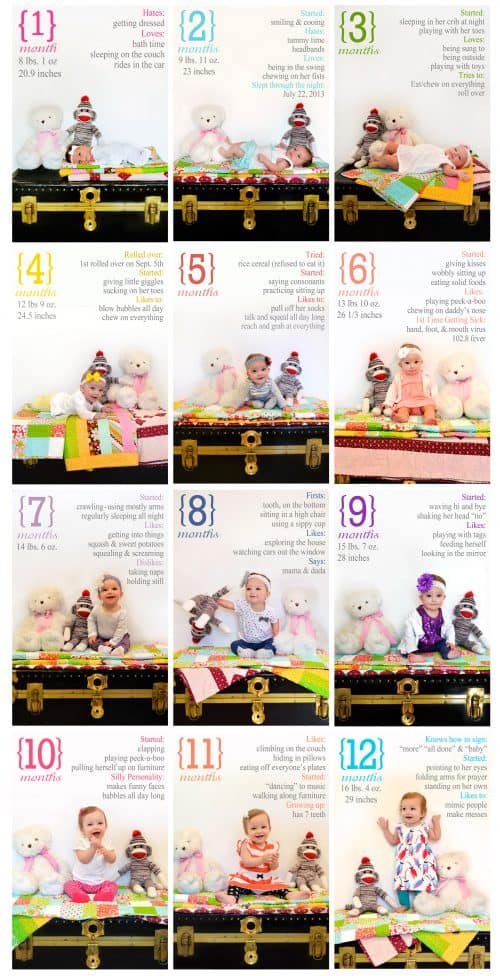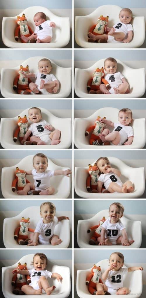 Toys and lovies can be great props for baby milestone photos. Grab a favorite stuffed animal and keep the background the same like this Monthly Baby Photograph Idea from Kristen Honeycutt. We did this with our twins. One child had a raccoon and the other had a fox. This helped us identify who was who in our identical twin photos.