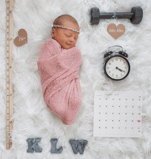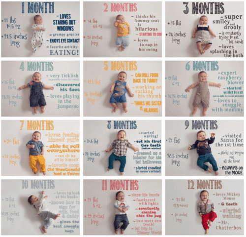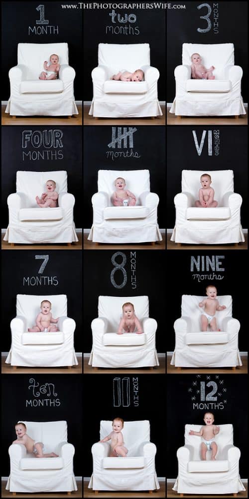 The Photographer’s Wife did a great job using a simplistic chair with a black background and chalkboard Font. Baby’s pictures can be taken in front of a painted chalk board wall and you can have fun with the 1-12 roman numerals. Don’t want to paint your walls? Use chalkboard contact paper or paint a board. Or take this picture with a green wall or even black while and play with ah chalk font in the Canva platform.
