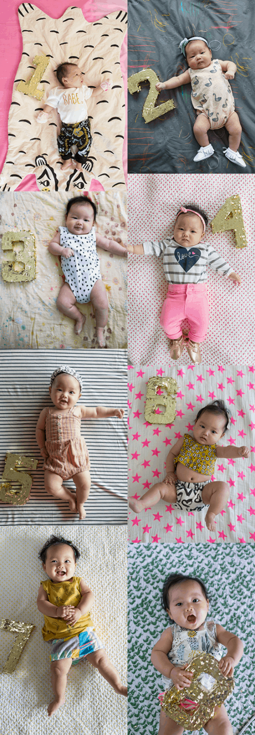 Mix patterns and textiles with baby. If you are artsy, enjoy adding different background and textures to your baby photos. Go gold using bright colors and a fun standout number in this Monthly Baby Milestone Idea from Oh Joy!